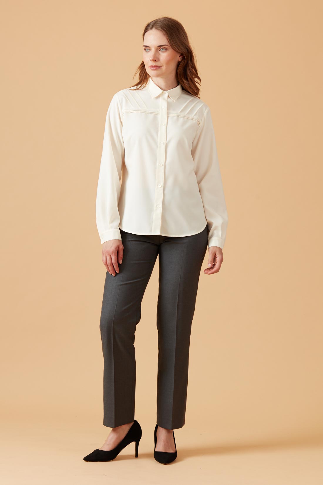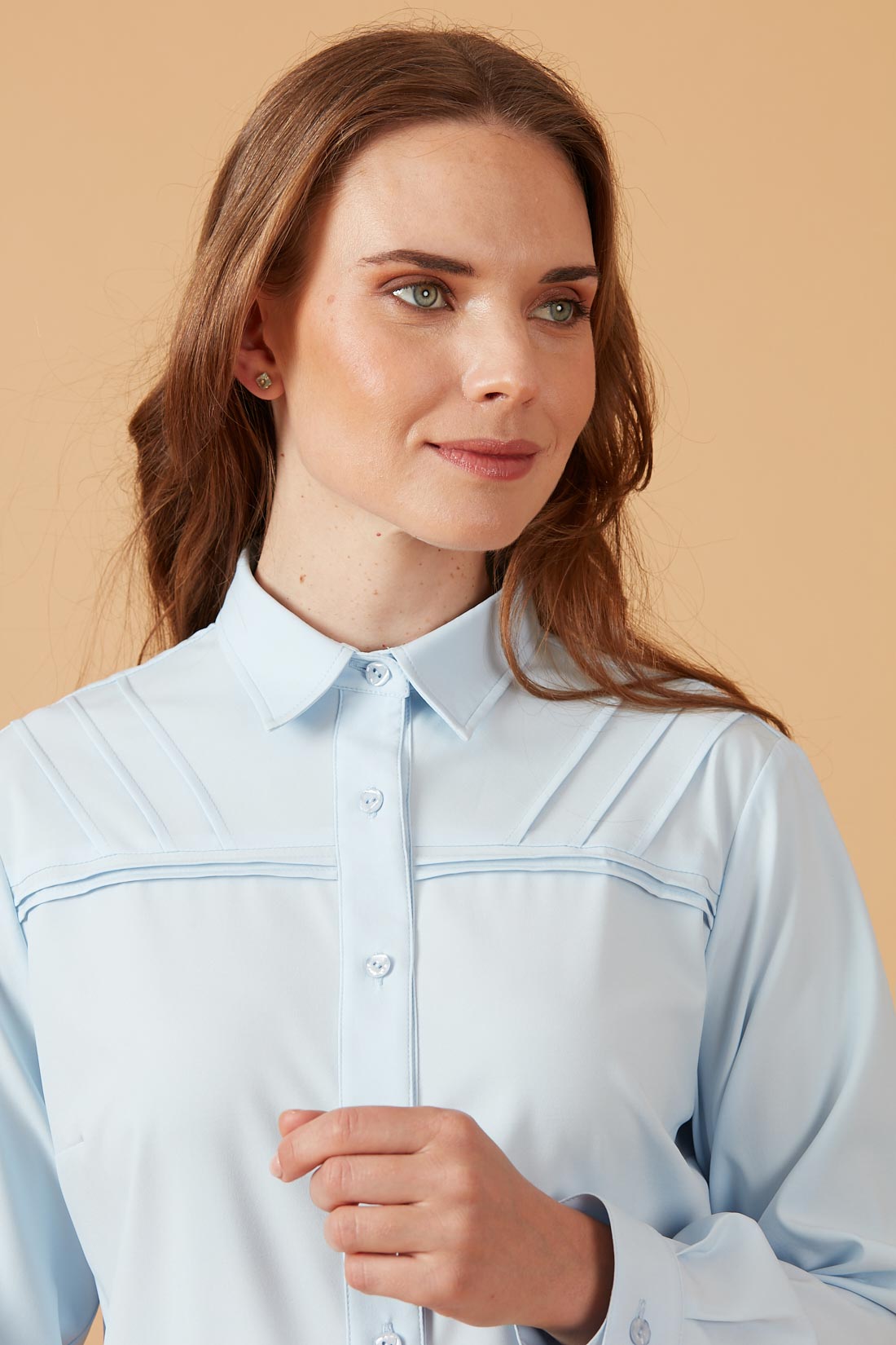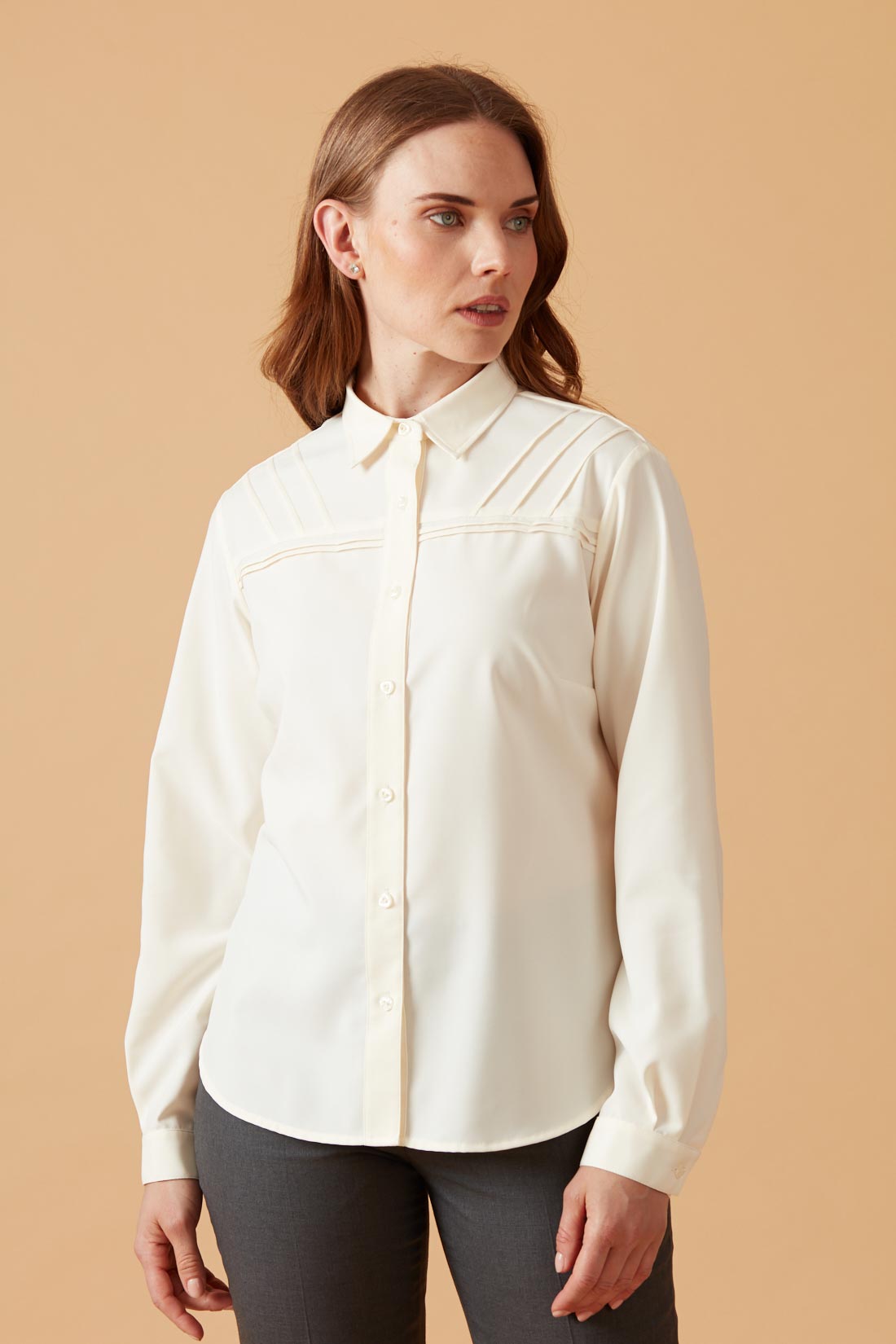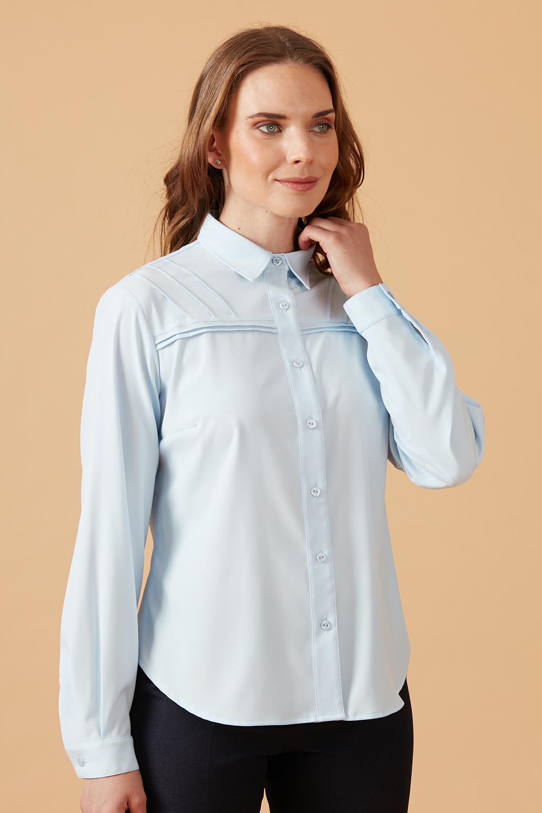 Blusa camisera con detalle de alforzas en diagonal en canesú.