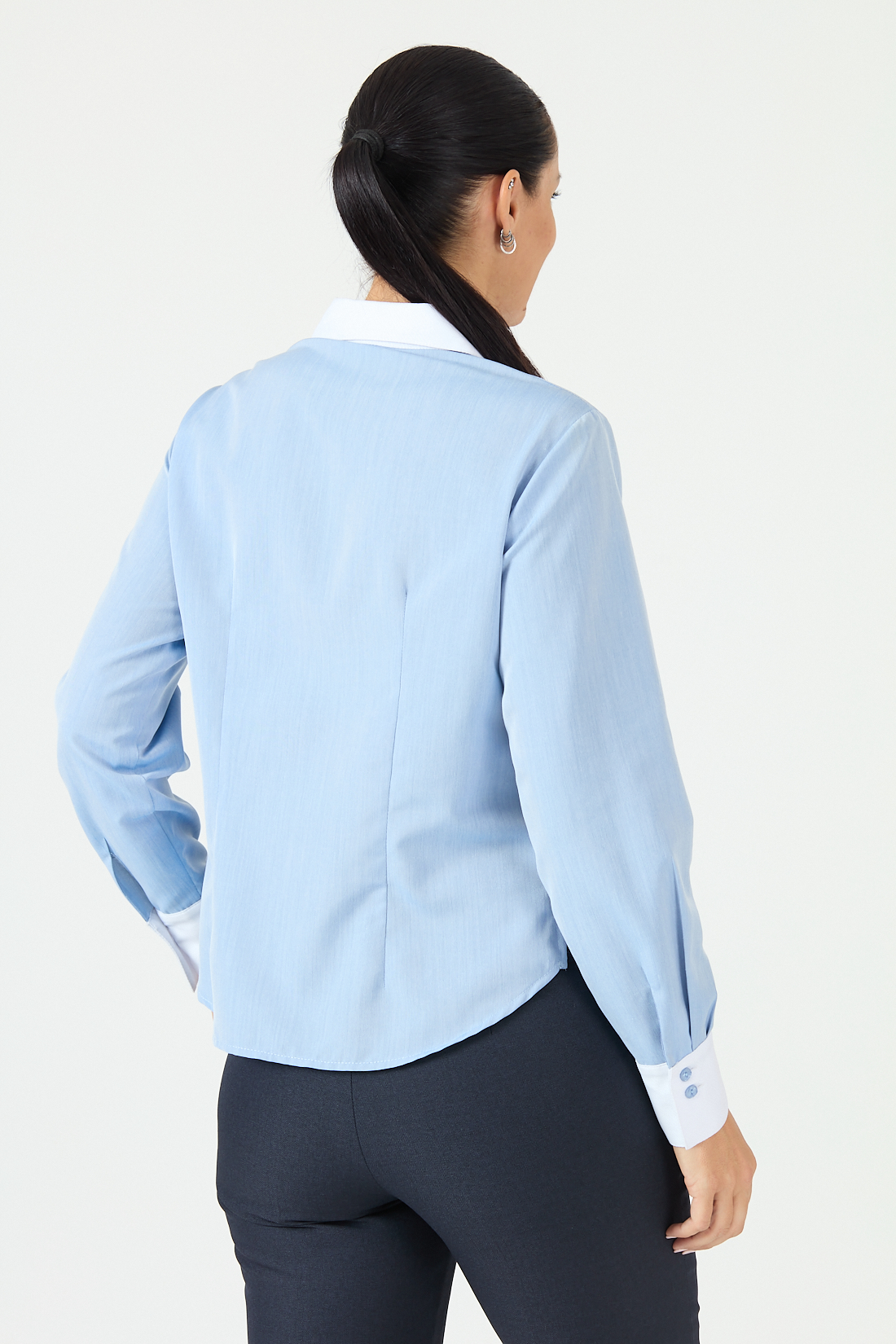Blusa manga larga, cuello camisero en punta.