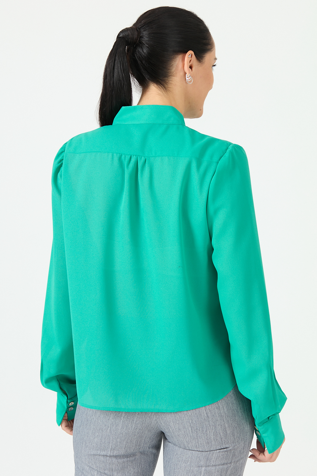 Blusa amplia con cuello alto cuadrado, abotonadura con pabilos.