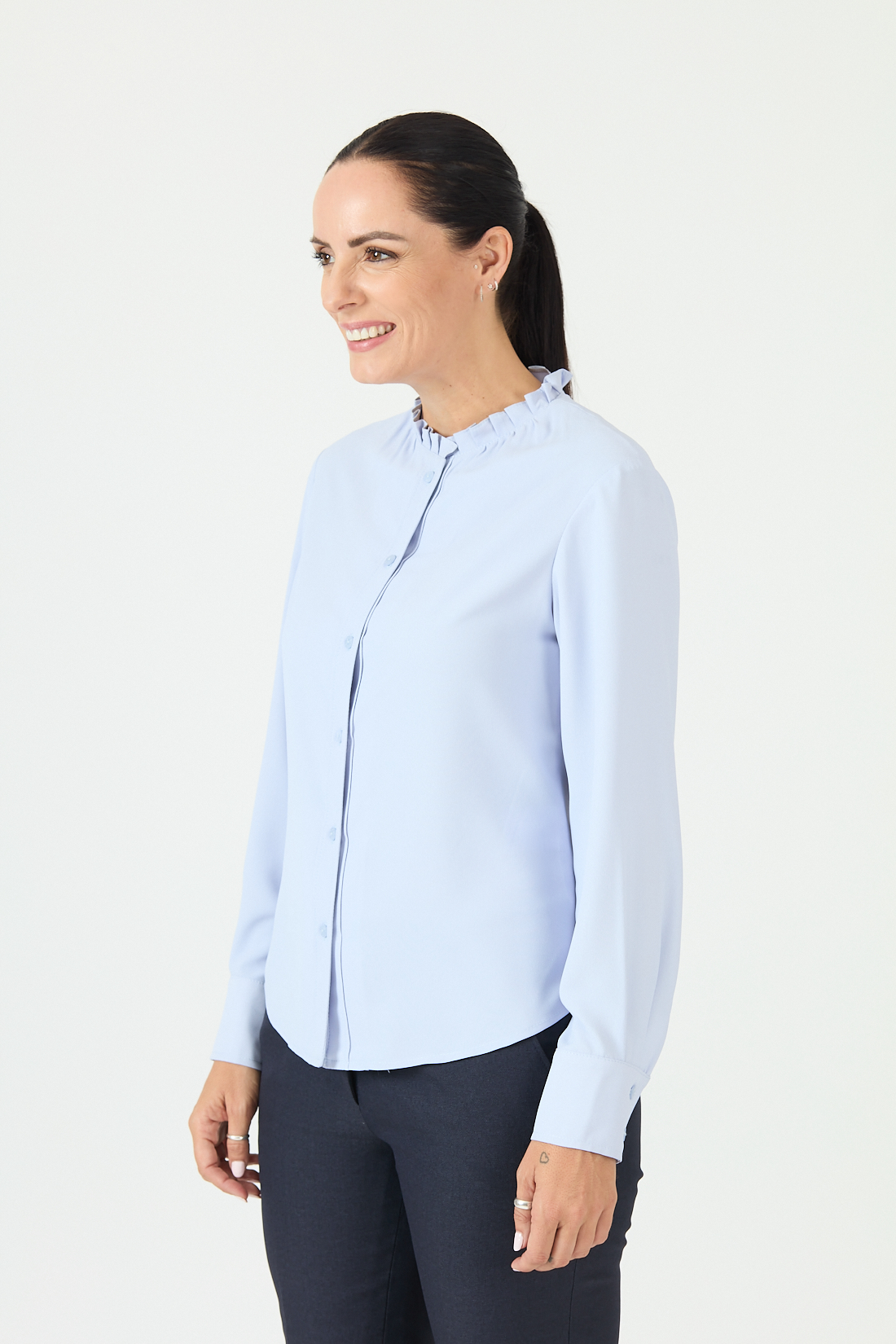 Blusa manga larga, con cuello alto recogido.