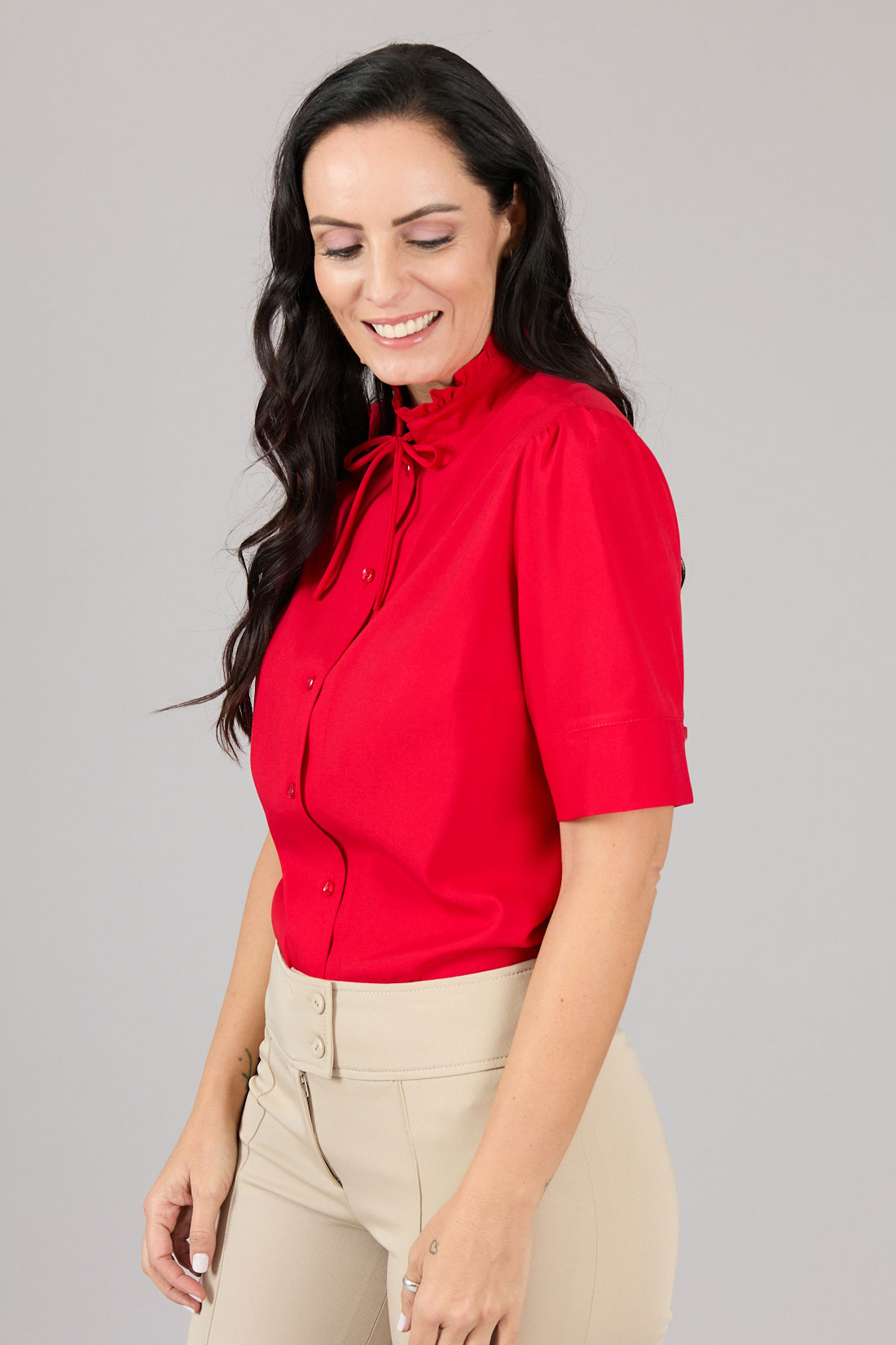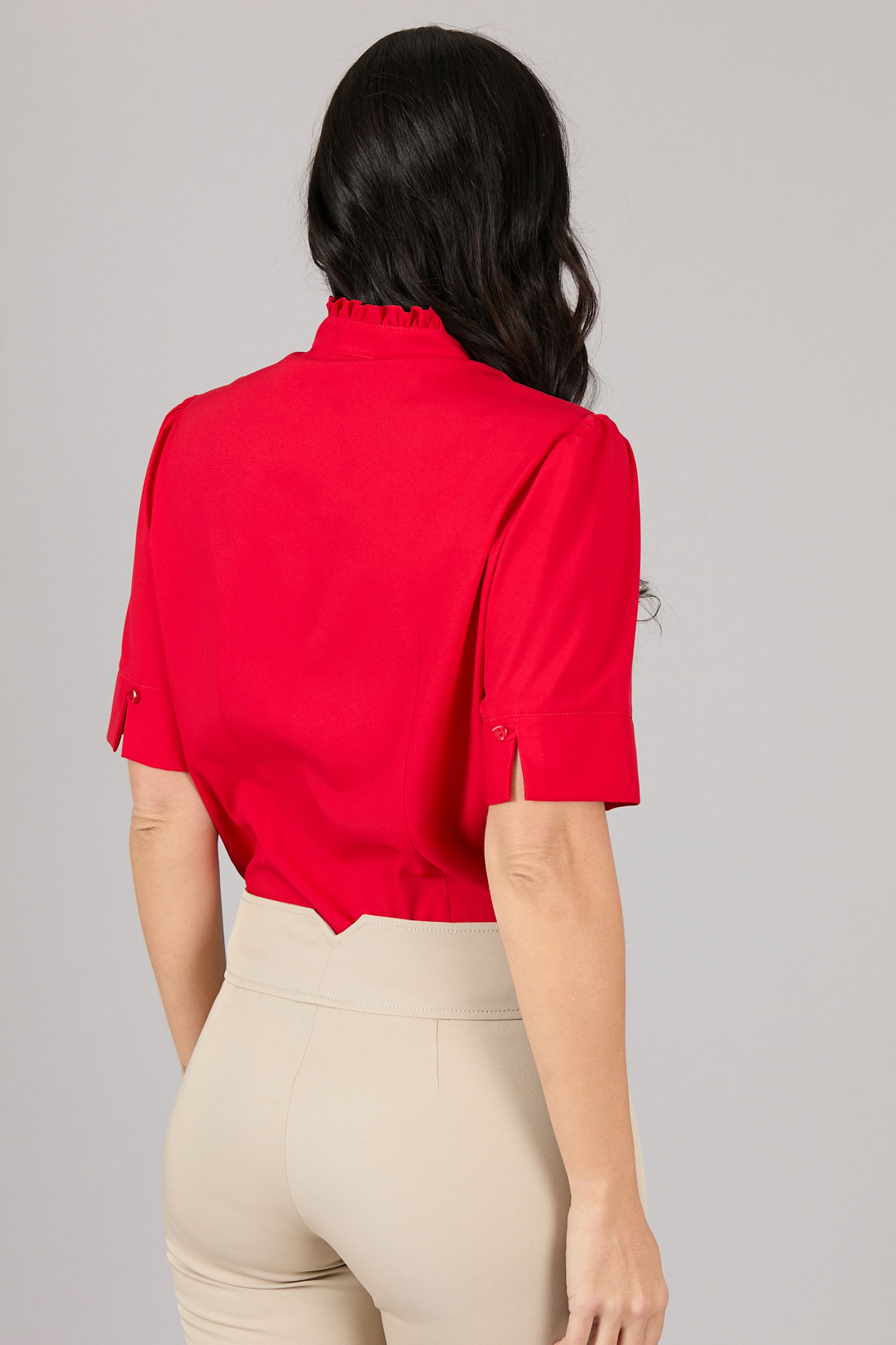 Blusa cuello mao, con recogido en borde y pabilo amarrado.