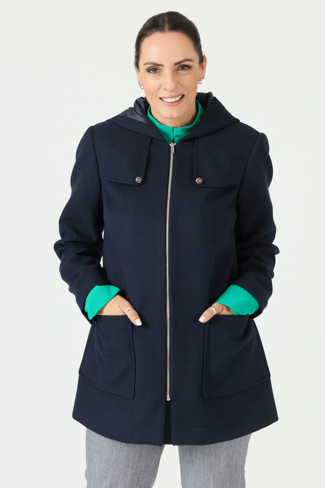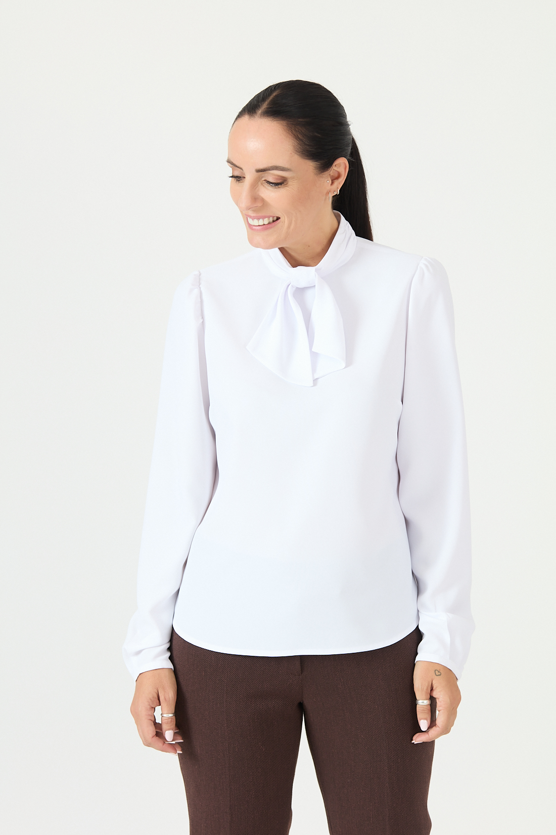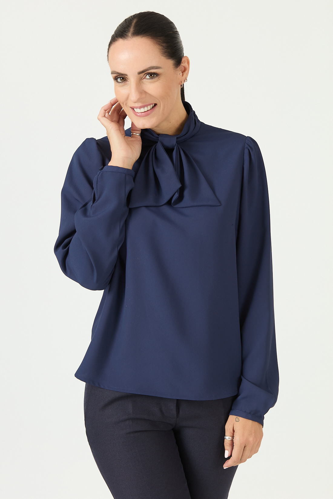 Blusón manga larga, con cuello alto, con lazo sobrepuesto en cuello.