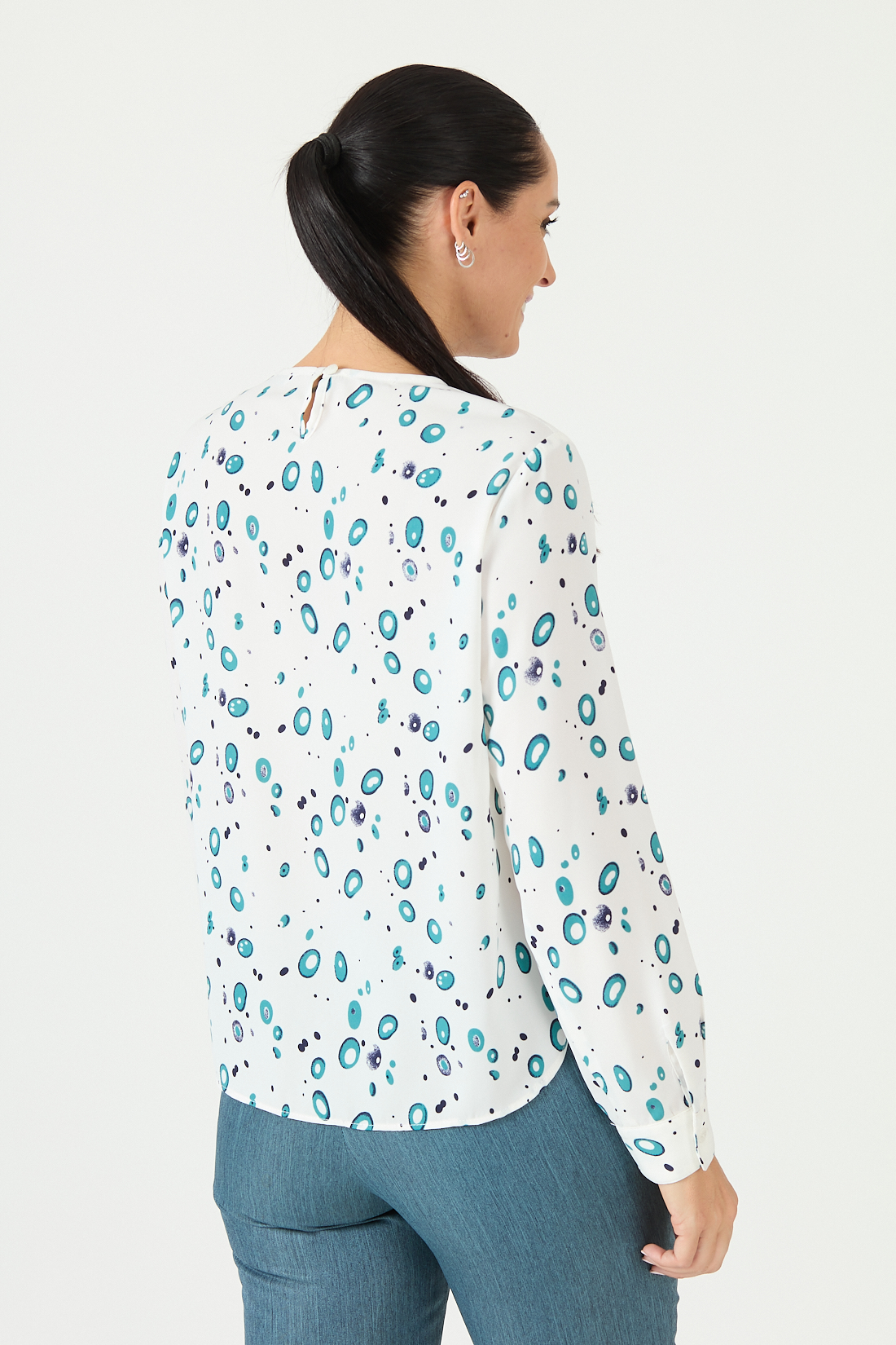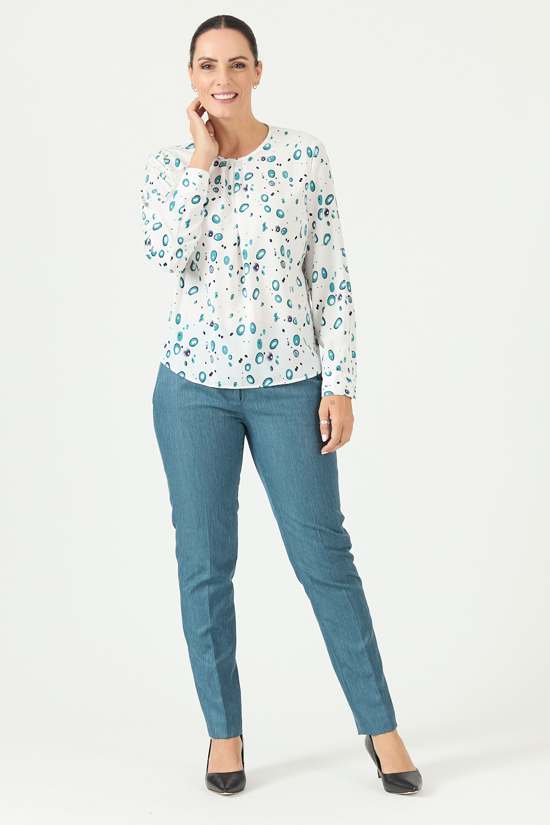 Blusón manga larga, escote redondo con pliegues en el centro.