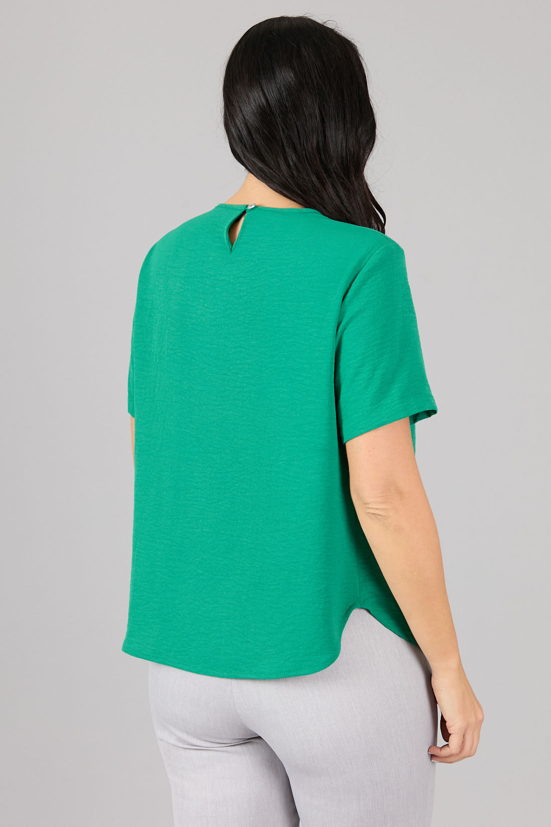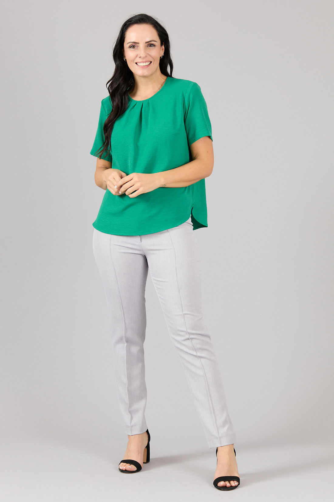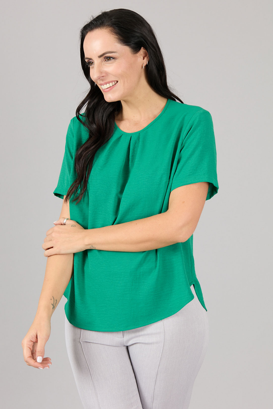 Blusón cerrado, escote redondo con pliegues en el centro.