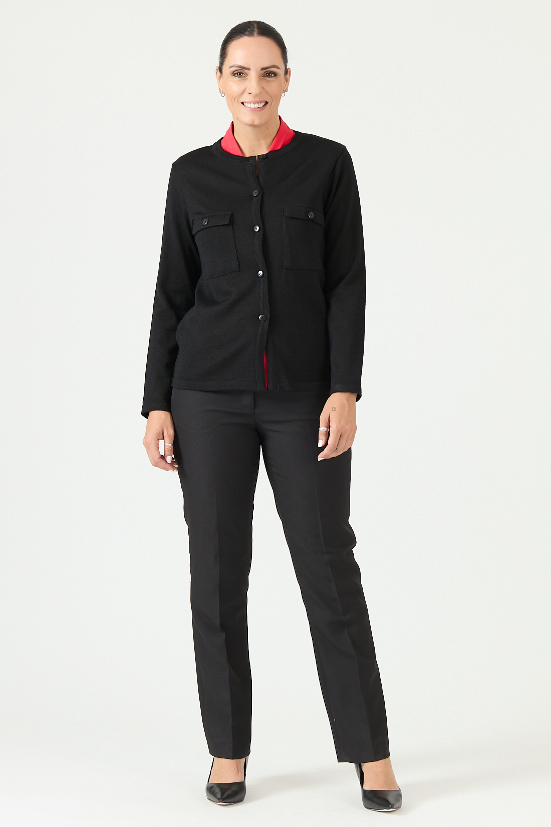 Chaleco tejido manga larga, con bolsillos de pecho.