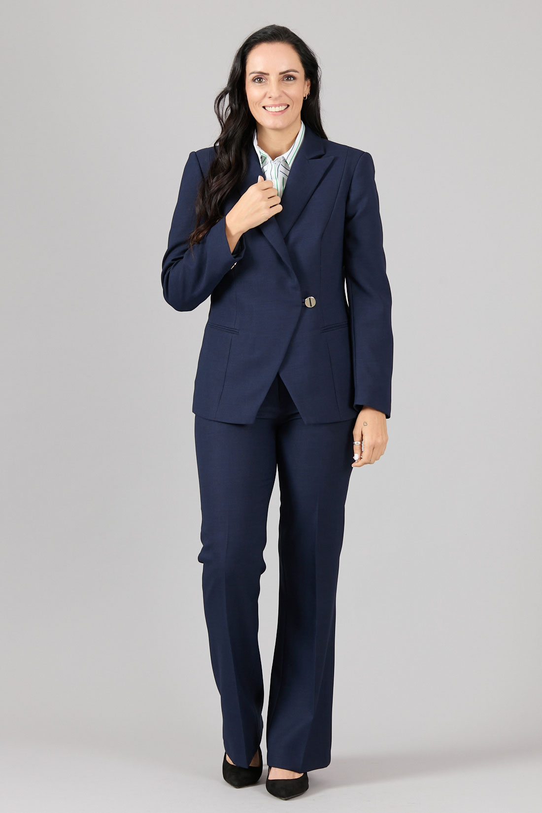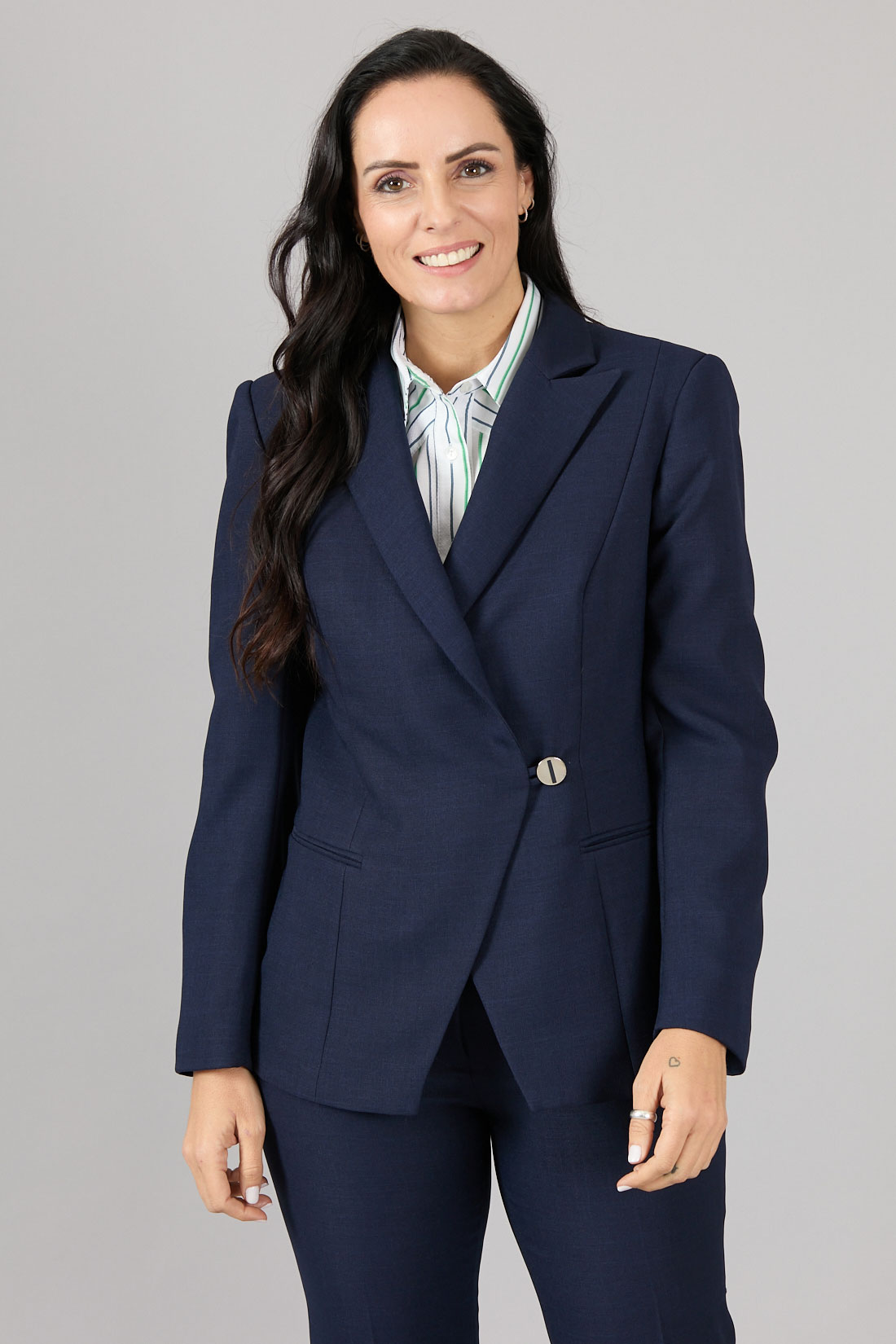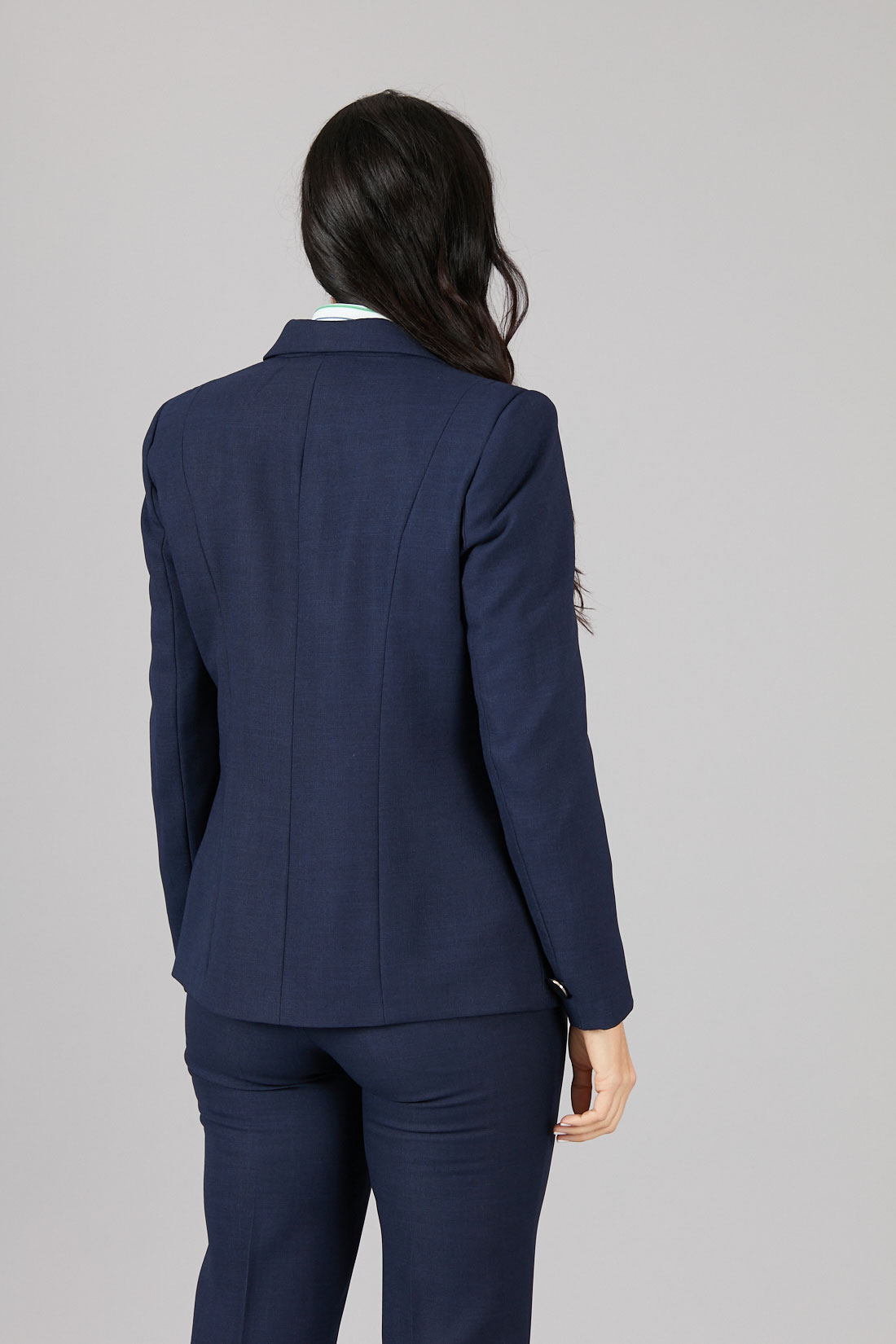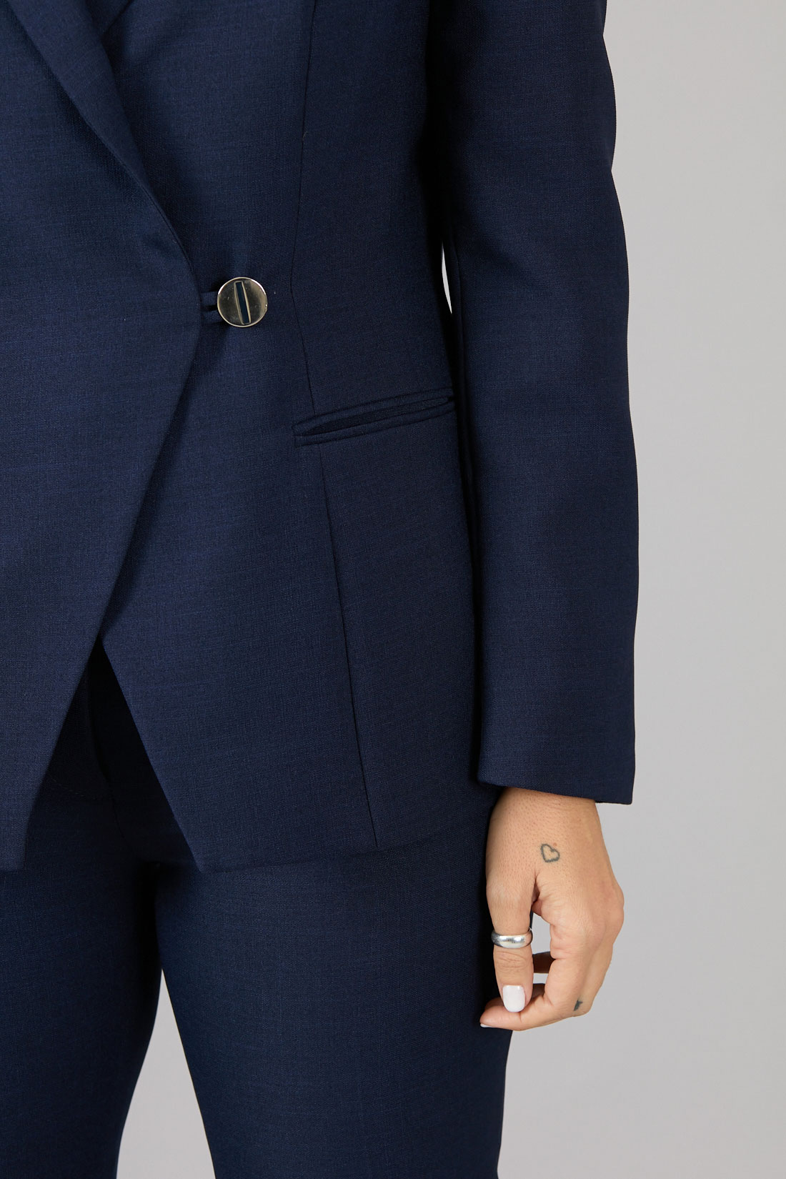 Chaqueta cruzada con corte diagonal, un botón con pabilo.