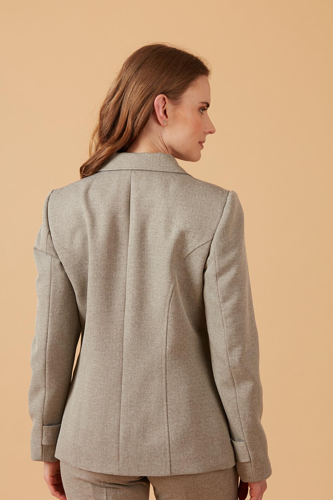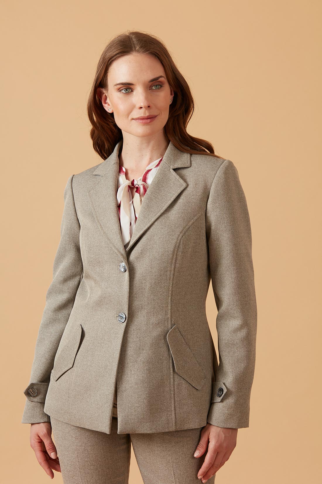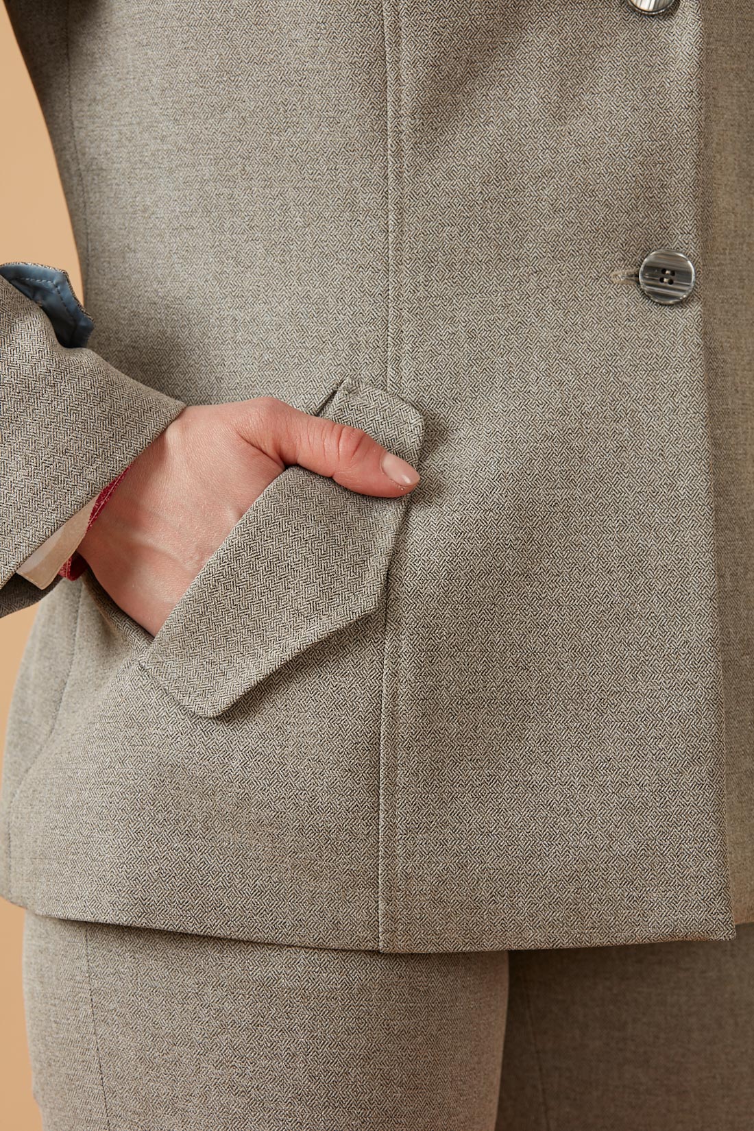 Chaqueta larga clásica con tapetas decorativas bajo bolsillos.