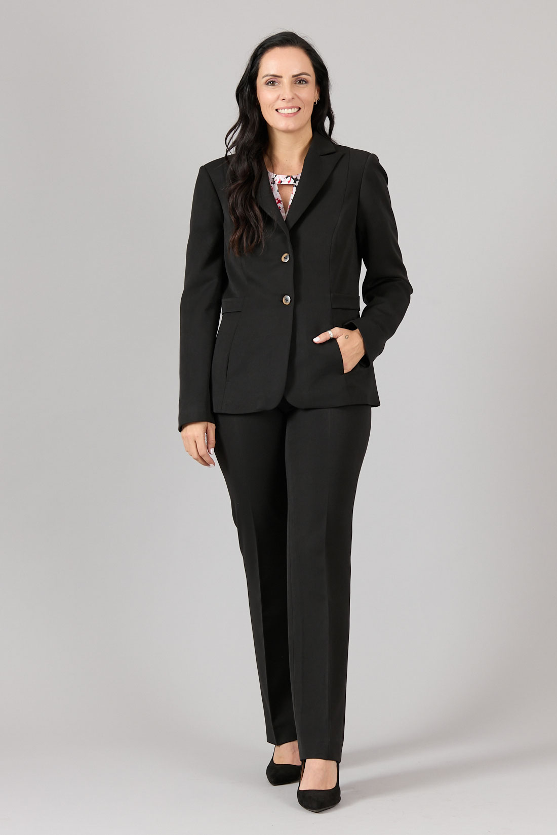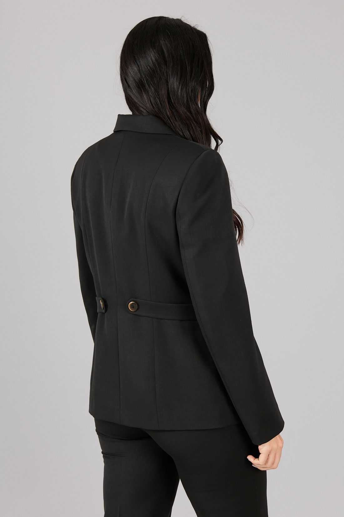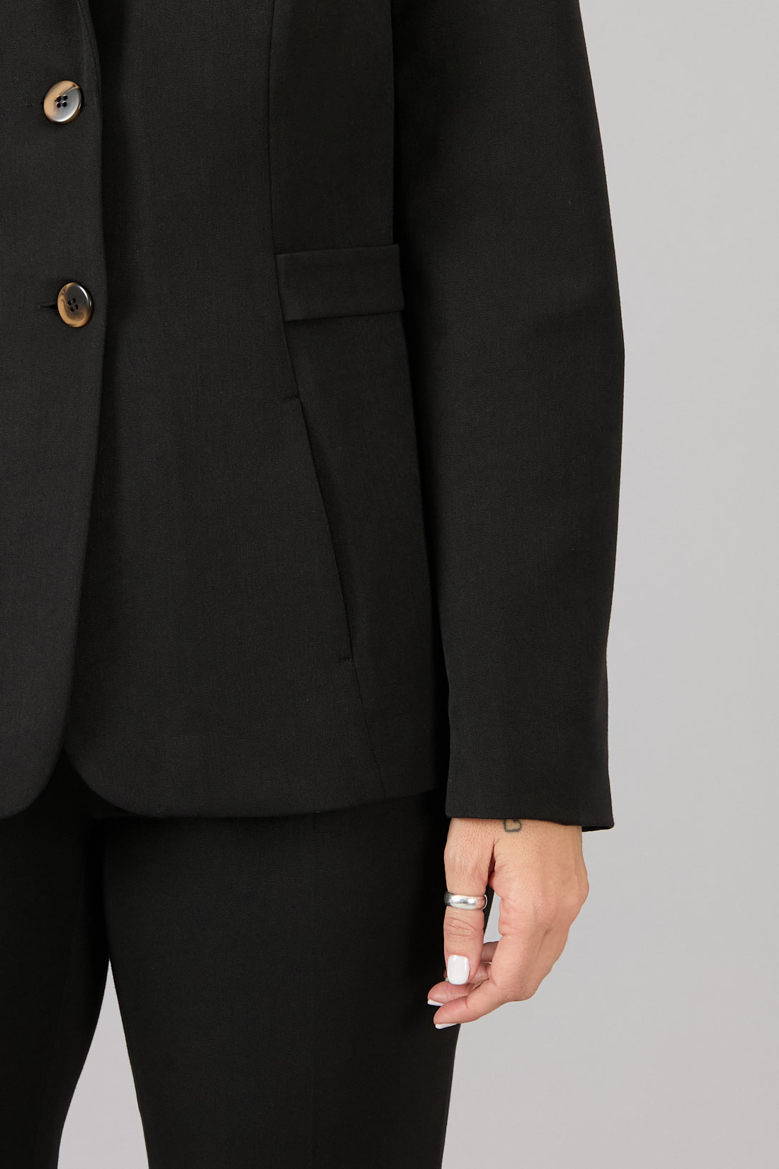 Chaqueta con dos botones, trabas con botones decorativos y bolsillos en cortes.