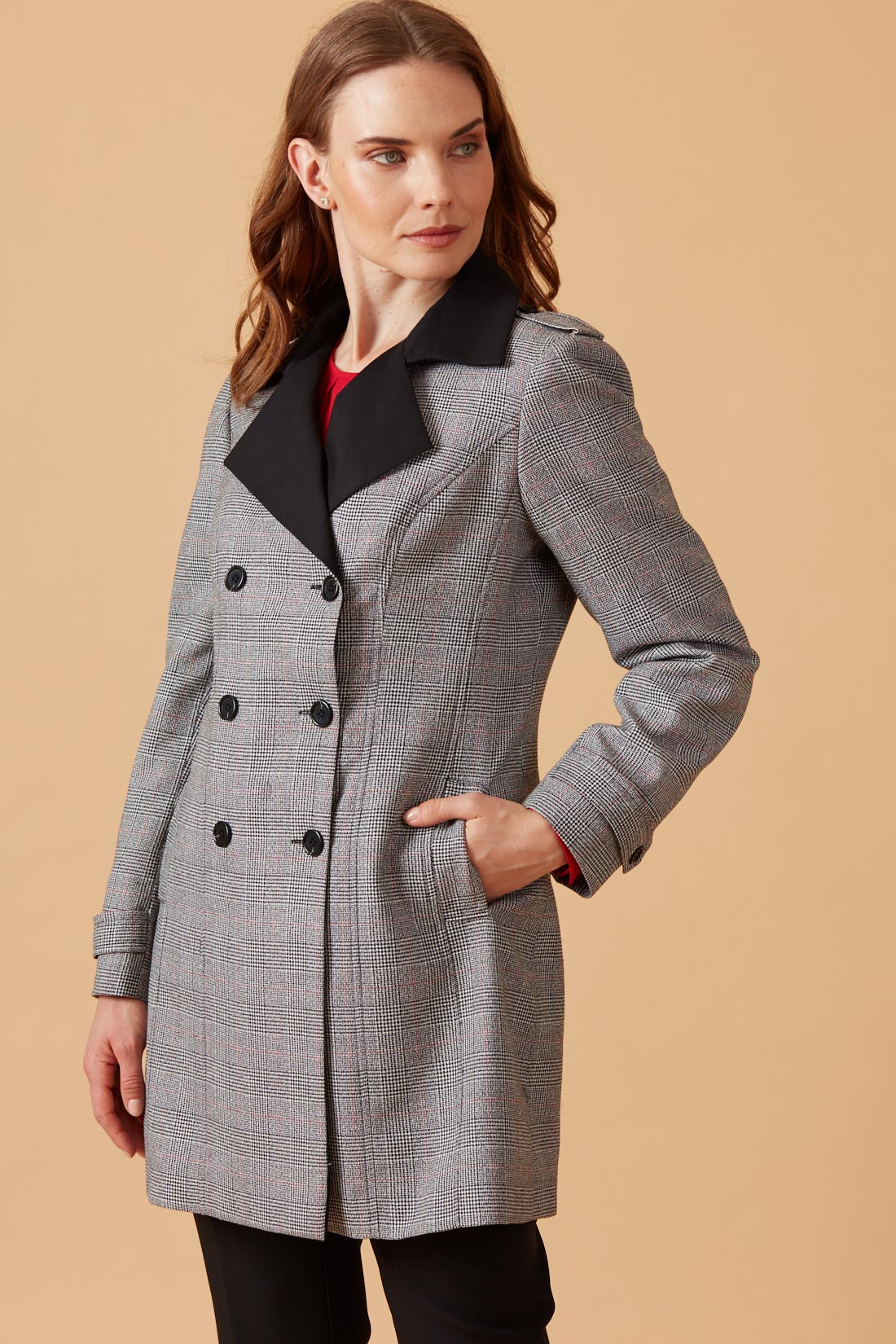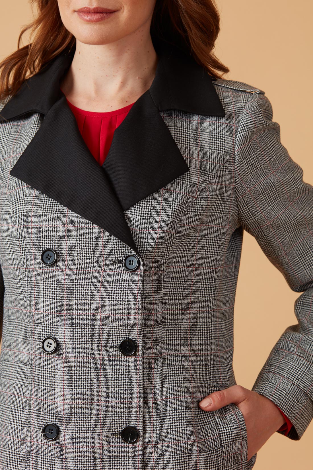 Chaquetón corto cruzado con cuello y solapa en contraste.