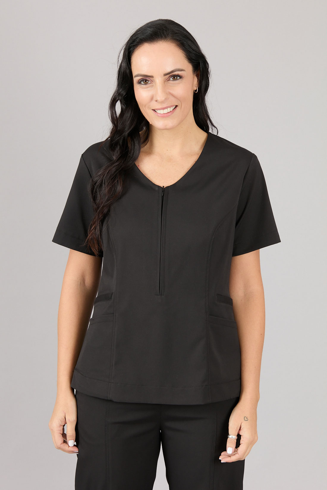 Top manga corta, 4 bolsillos y cierre en delantero.