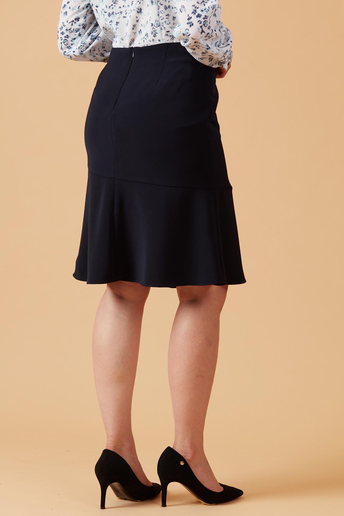 Falda sin pretina, con corte diagonal y amplitud en ruedo.