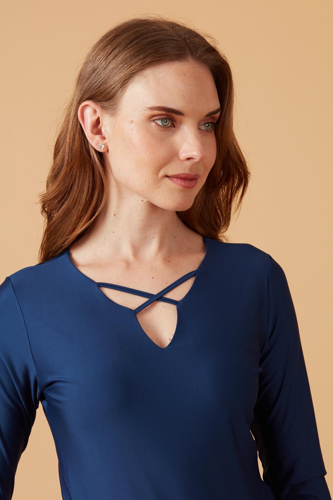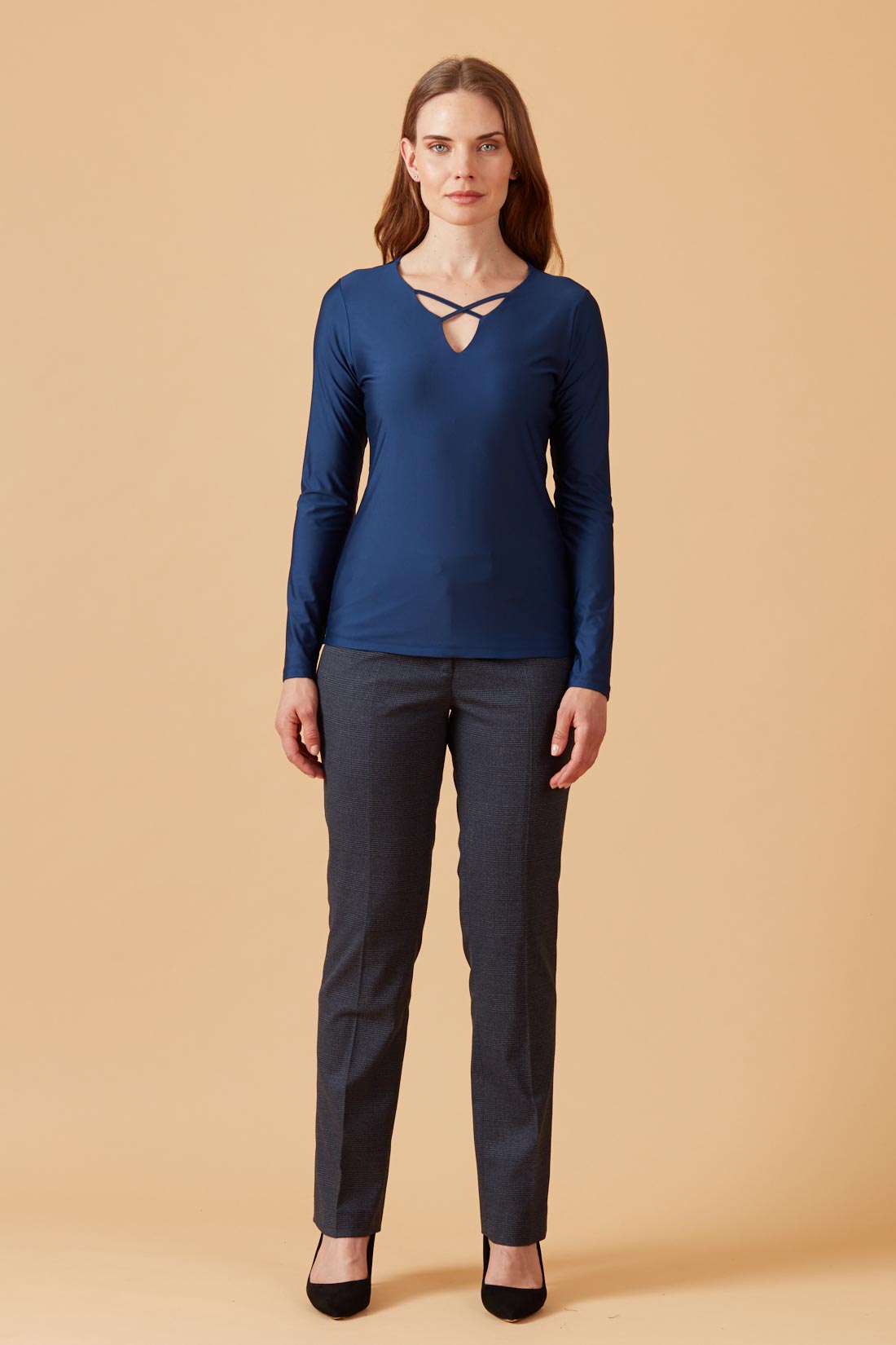 Polera con escote en forma, con pabilos decorativos en cruz.