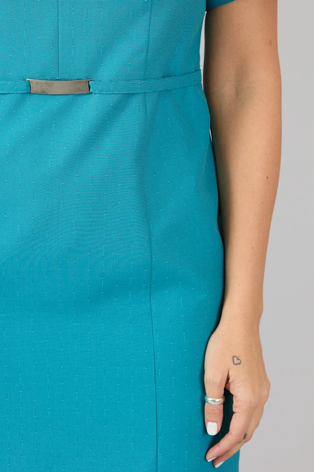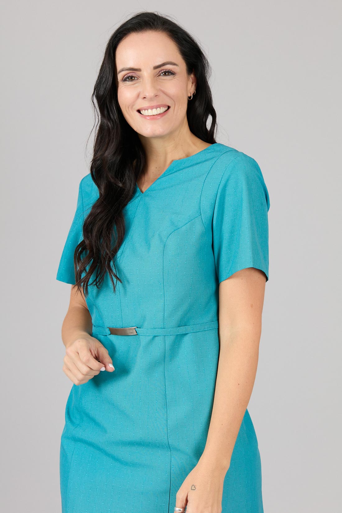 Con cortes decorativos en hombros, lazo cintura con adorno metálico.
